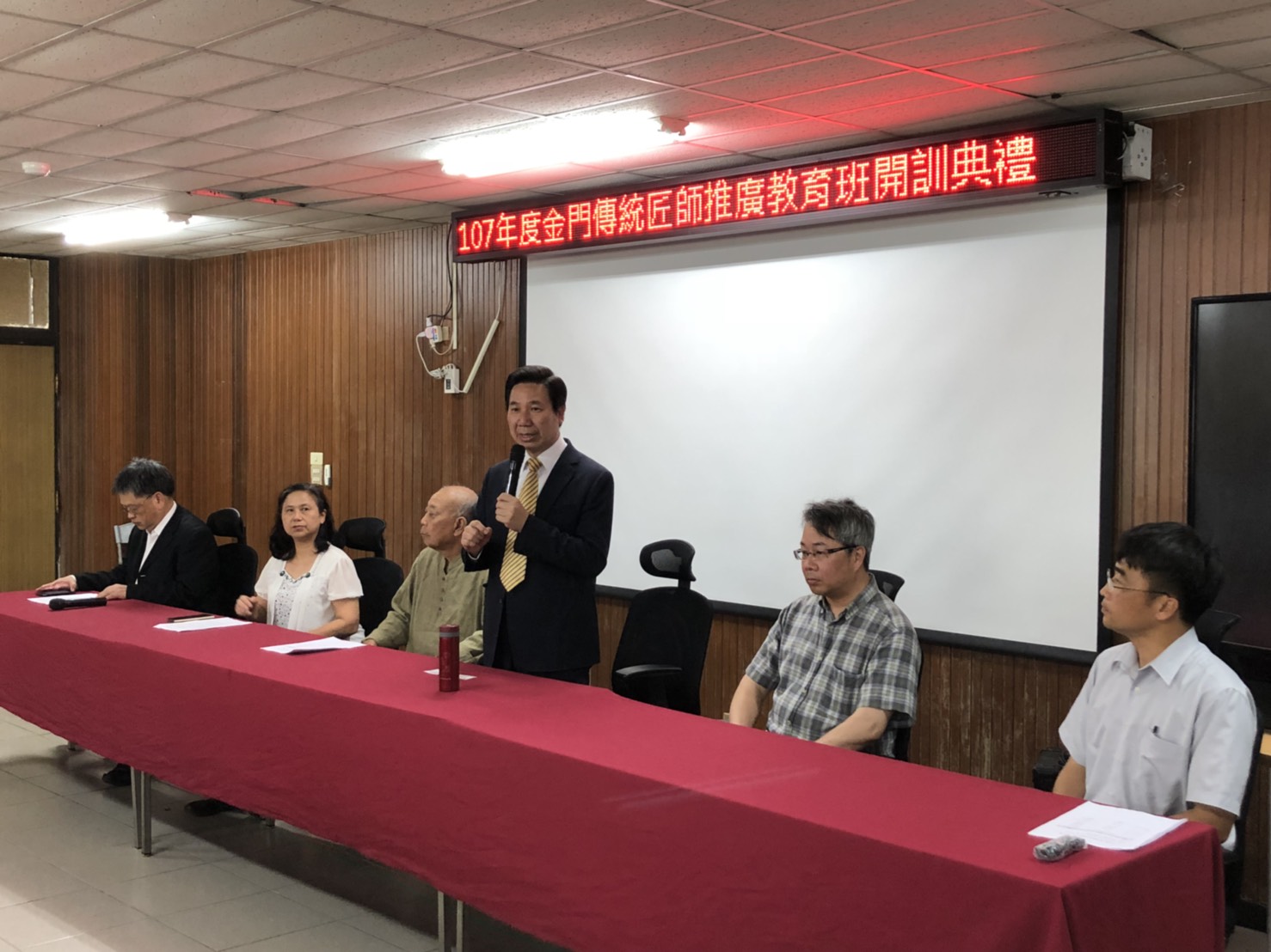 陳縣長在致詞中表示,金門縣擁有4000餘棟的傳統建築,構成金門成為傳統建築風貌的文化重鎮,雖然金門國家公園管理處及金門縣政府自民國90年起陸續投入傳統建築風貌的補助工作,但是對於匠師培訓欠缺一個長期的計劃,造成縣內傳統建築修復能量不足或是修復人員欠缺傳統建築技能,為解決傳統建築修復人員年齡老化之窘境、厚植傳統建築修復能量及累積專屬金門傳統建築修復技能,縣府特擬定「金門傳統匠師推廣教育班」之培訓,