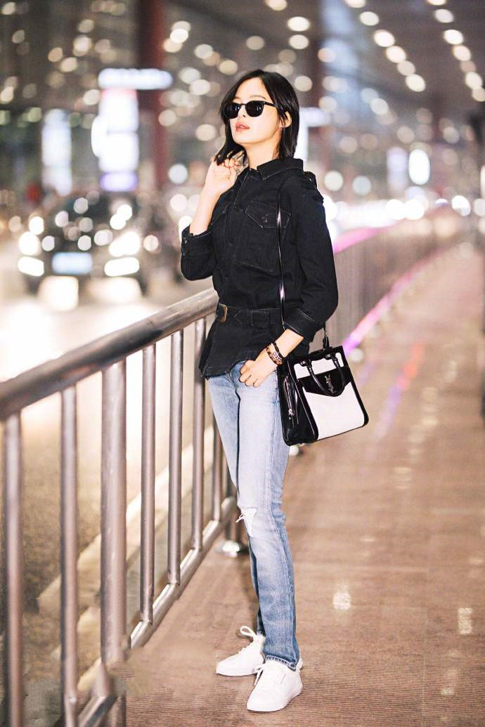 辛芷蕾私服偏愛黑棕等深色, 一件黑色牛仔外套搭配藍色牛仔褲,腳踩小白鞋,搭配黑白色的包包,簡約隨性,腰間繫上一條腰帶立刻讓整個造型加分不少,又颯又美,黑色墨鏡和她那張冷漠臉,一副生人勿近的樣子,很酷了。