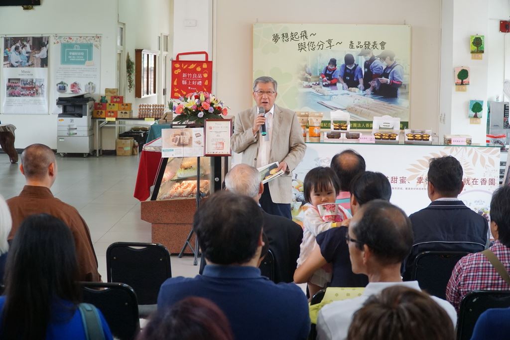 新竹縣湖口鄉香園紀念教養院4/21日舉辦「夢想起飛-與您分享烘焙產品發表會」,縣長邱鏡淳、縣議員陳栢維、湖口鄉長林志華、新豐鄉長徐茂淦等人,前往為一群認真工作的院生加油打氣,並在工作人員引導下,手作「草莓塔」,看到一盤盤的「德式蛋塔」、「草莓塔」及「雪Q餅」陳列在展示台上。