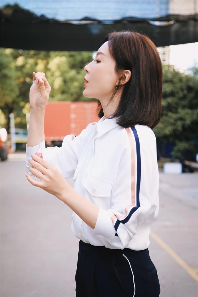 能看到陳數的白襯衣其實挺簡單的,三顆紐扣做點綴加上燈籠袖,倒是下身搭配的寬腰帶是亮點,不知道是裙子還是褲子呢