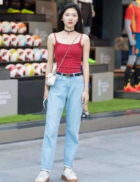 在一家體育用品店門前遇到了運動款的女孩,紅色的弔帶上衣顯出一種健康之美,鮮艷的顏色和美麗的膚色互相映襯,牛仔長褲搭配運動休閑鞋更加是舒適美麗,讓整個人顯得活力十足。
