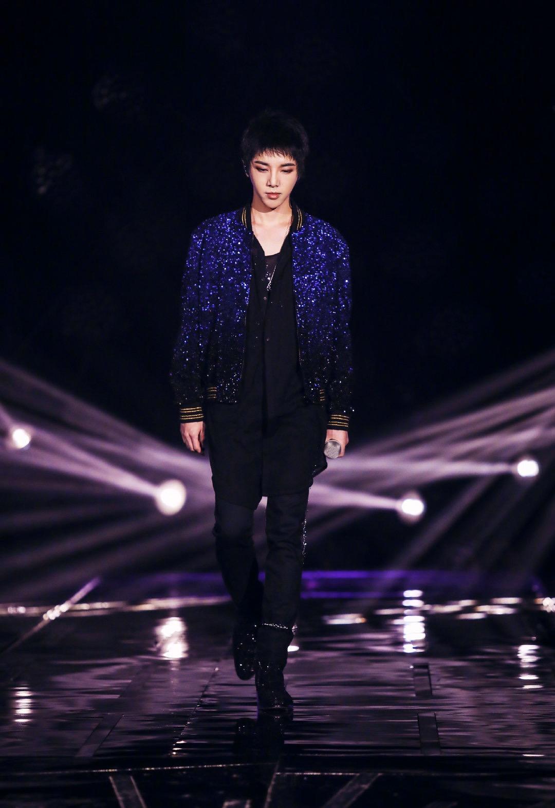 深藍色亮片短外套搭配黑套裝,腳上是同亮片系的黑色短靴。一身鬥牛服的他踏上舞台就獲得了全場的喝彩。不僅是歌,他的服裝搭配也獲得了很高的評價。