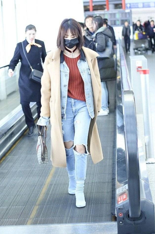 蔡依林在穿搭上很會揚長避短,雖然身高不到160,但是可以穿的十分顯高。這次亮相機場運用了疊穿的方式為我們帶來了大衣+牛仔外套的疊穿造型,不同材質的碰撞讓造型更有層次感,在用色上大膽的選擇了酒紅色內搭,個性十足。