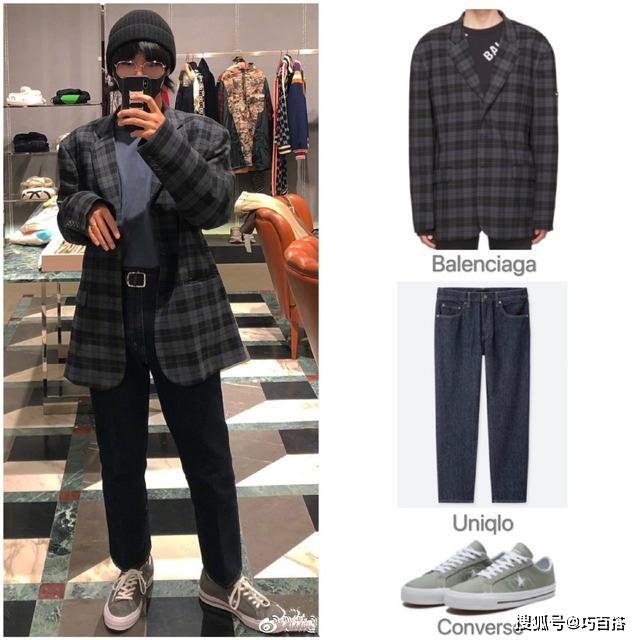 韓火火的衣品真的沒話說,無論男裝女裝他都能輕鬆駕馭。第一套穿搭是深色系的,沒有明亮顏色的扶持想要穿出驚艷四座的效果,還得看小細節的設計。深色系對於像韓火火這樣黑皮的男生來說容易顯老,所以要搭配幾件彰顯年輕氣息的單品,比如針織帽,金絲平面鏡,斜挎包和帆布鞋。他用深藍色修身版內搭搭配Balenciaga格紋西裝外套,下裝搭配一條深藍色牛仔褲,一米七八的身高穿起來毫無壓力。