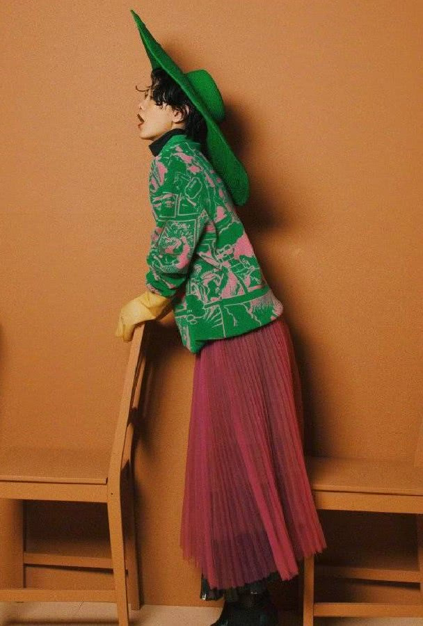 郭采潔拍復古港風時尚大片,宛如行走的畫報。她身穿一件綠色的毛衣,上面布滿了粉紅色的線條和色塊花紋,紅綠色的搭配絲毫沒有違和感,反而透出時髦感,非常好看。她在下面穿着紅色長裙,時尚滿分!