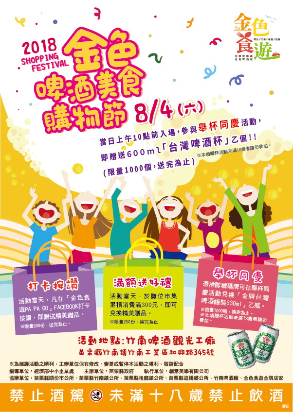 苗栗縣政府積極打造「苗栗金色啤酒城」意象,全力推廣中港溪下游四鄉鎮(竹南、頭份、後龍、造橋)「金色食遊」美食遊憩品牌。適逢盛夏炎暑,為吸引更多民眾利用暑假期間來苗栗旅遊,今年縣府特別與竹南啤酒廠合作,規劃辦理「2018金色啤酒美食購物節」,廣邀全國民眾一起來苗栗狂歡、暢飲。本次金色啤酒美食購物節精心安排精彩的表演節目,規劃金色食遊在地美食及特色伴手禮市集,更設計多項趣味競賽等活動,讓現場民眾享受啤酒美食的歡樂饗宴。