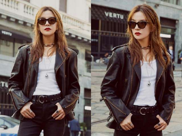 但自從她瘦了之後,整個人就開始開掛的變美了,而且穿衣品味也是越發的提高,有時尚達人的風範!墨鏡皮衣白T恤,非常帥氣!